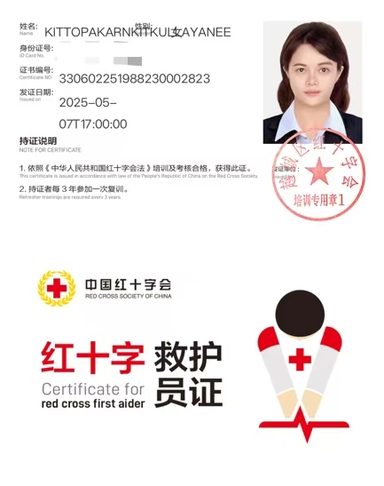 近日,永利官网泰国籍外教郭贤(KULLAYANEE KITTOPAKARNKIT)顺利通过越城区红十字会应急救护培训考核,取得救护员证书。她表示:“掌握急救技能不仅是对自身保护,更是对身边人的一份责任。‘人道、博爱、奉献’是红十字精神的核心,我希望能在关键时刻伸出援手,帮助有需要的人。”