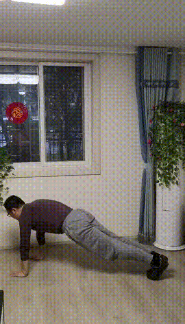 双脚并拢,俯身下蹲,双手撑地与肩同宽,同时双腿向后跳跃伸直