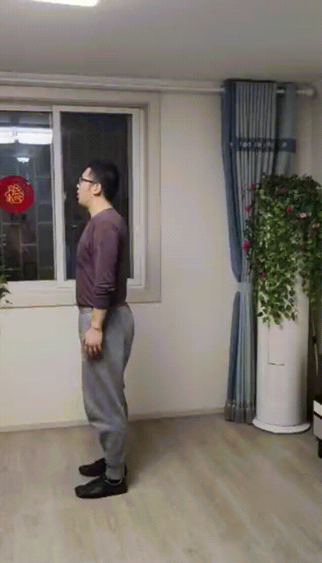 双脚开合跳跃,小腿尽可能放松,不可低头、仰头。