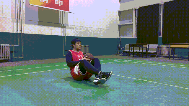 准备动作:身体坐在地板上,脊椎处于中立位,保持腰部、背部挺直,双手持球放在身体的前方,双腿屈膝成90度夹角,脚跟着地。