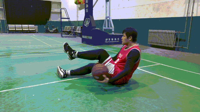 动作要领:抬起双腿,保持双腿的稳定,上半身向后微倾,然后收缩腹部肌肉,两腿交替摆动,同时将球从胯下连续交接球。