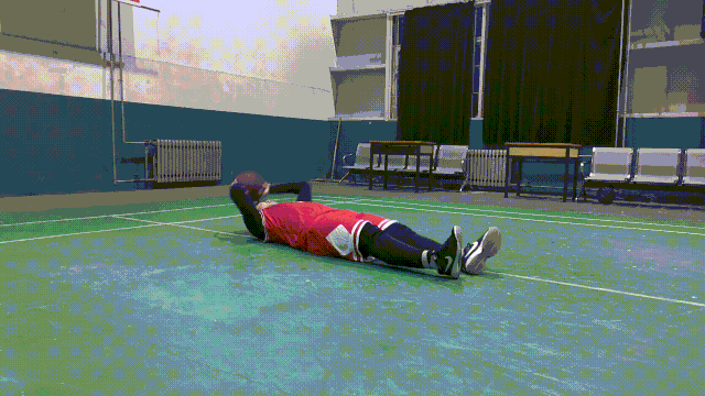 动作要领:收紧腰腹部,然后屈肘让重心下降至贴近地面的位置,再集中胸肌的力量快速推起后,将篮球换手,继续重复进行