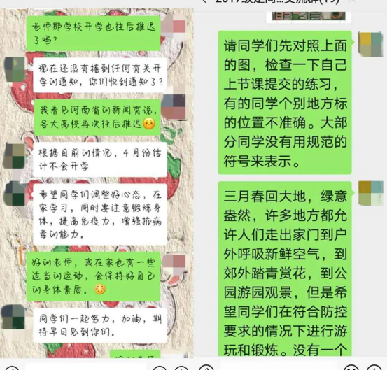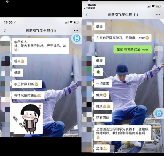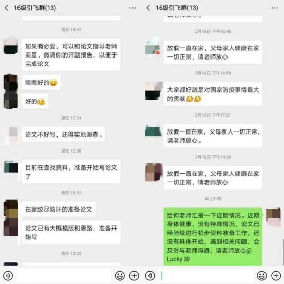 在疫情防控期间,2018级创新引飞导师尚远芳老师利用微信群积极传播“正能量”, 每天统计学生所在地,做到工作细致有序、落在实处。同时方老师加强学生的思想政治教育,引导学生更好地继承和发扬爱国主义精神,增强责任意识。 在此期间,老师虽不能与学生一起面对面交流,但也经常联系我们,询问学生的健康情况,带给学生最及时的关怀,这使学生深有触动。同时,尚老师为学生生送去假期“大礼包”及时进行检查监督,积极关心学生现状,传达疫情信息,做好情绪疏导,指导综合学习,倡导学生健康作息、科学防护、加强学习。