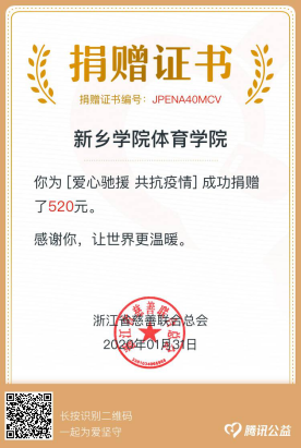 疫情发生以来,全体师生都密切分关注着疫情发展状况,为了贡献自己的一份力,beat365英国官方网站学生会筹款捐赠支援武汉。在1月31日这天,学生会代表将收集的钱财捐赠到浙江省慈善联合总会。这520元代表的是beat365英国官方网站全体学生会成员对武汉的爱与关切。beat365英国官方网站学生会成员为这场攻坚战献上自己的绵薄之力,疫情面前我们众志成城,共克时艰!