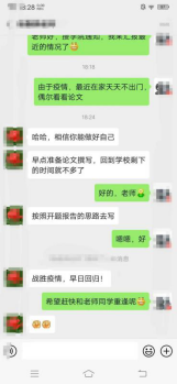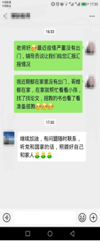 2018级导师李扬老师,因部分同学因寒假打工时突遇疫情大爆发,被困他乡,李扬老师年前刚刚做完阑尾炎手术,尚未痊愈出院,及时与外地学生取得联系,了解关心学生身体状况的同时,不断安慰着学生,平复着同学们 独在异乡的乡愁与紧张的心理。