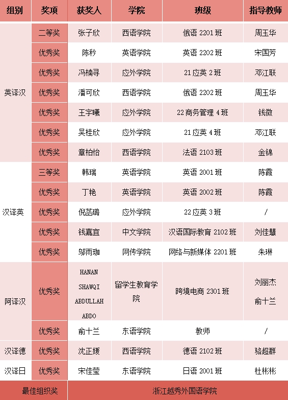 2023年10月17日,第三十五届韩素音国际翻译大赛获奖名单揭晓。永利官网师生获二等奖1项、三等奖1项、优秀奖14项,学校获最佳组织奖。学校获奖数量全国排名第七,浙江省排名第一。
