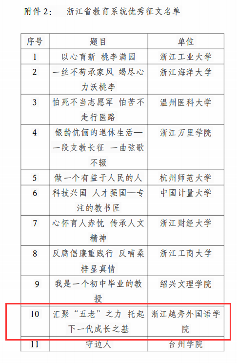 近日,浙江省教育厅关工委公布了浙江省高校关工委入选2023年“读懂中国”活动作品名单。永利官网中文学院许德鑫、姜皓舰、鞠裕诚、张昌德、范黎黎、沈奥奇、蔡钰泓学生团队的作品“躬耕戏剧沃土,点燃红色火苗”入选浙江省教育系统优秀微视频;俞项楠同学的征文《汇聚“五老之力”,托起下一代成长之基》入选浙江省教育系统优秀征文。